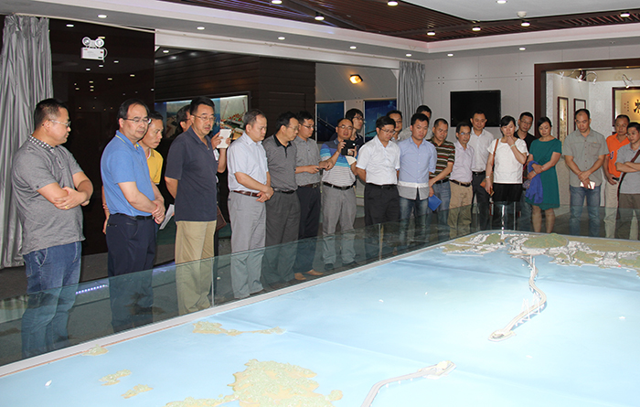 在港珠澳大橋管理局展廳,管理局蘇權(quán)科總工程師向考察團(tuán)介紹了港珠澳大橋建設(shè)背景、工程概況、技術(shù)難點(diǎn)、工程進(jìn)展等情況。集團(tuán)公司學(xué)習(xí)考察人員就工程建設(shè)管理模式、防災(zāi)減災(zāi)設(shè)計(jì)、耐久性設(shè)計(jì)、沉管對接方案、人工島筑島工藝等問題與大橋項(xiàng)目管理人員進(jìn)行了探討交流。