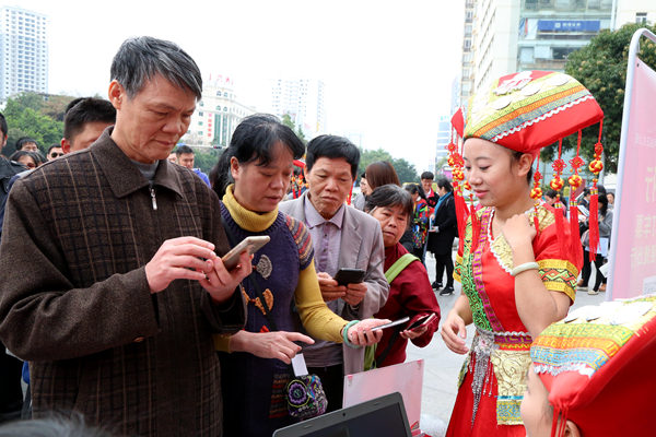 身著統(tǒng)一服裝,肩披綬帶、胸扣團(tuán)徽的ETC推廣青年突擊隊(duì)員向過往的行人宣傳ETC的相關(guān)知識(shí),耐心解答車主朋友們的疑問,并現(xiàn)場演示ETC八桂行卡的安裝過程,使廣大社區(qū)市民對ETC有了一個(gè)初步的認(rèn)識(shí)。6名身著靚麗壯族服飾瞬間吸引住了往來市民的眼光,紛紛前來咨詢業(yè)務(wù)。活動(dòng)期間,一卡通公司客服人員熱情地向社區(qū)居民發(fā)放了100張“桂民卡·體驗(yàn)卡”,亦有不少市民被桂民卡精美的版面設(shè)計(jì)和強(qiáng)大的互聯(lián)互通功能所吸引,紛紛在現(xiàn)場辦理購卡及充值業(yè)務(wù)。票通公司客服人員則向社區(qū)居民推介了廣西人自己的道路客運(yùn)網(wǎng)絡(luò)售票平臺(tái)——“桂客行”,耐心地向市民解析平臺(tái)功能、覆蓋范圍等,并協(xié)助市民下載“桂客行”手機(jī)APP。