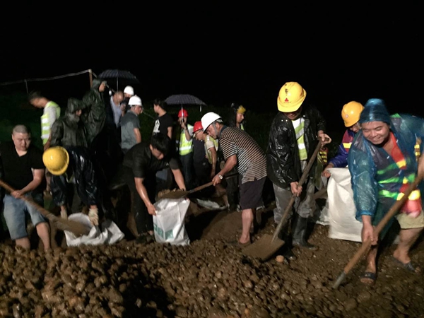 “十萬壟大堤出現(xiàn)險情,大家快去救援?!?月1日21時,湖南省湘潭市,廣西路橋集團環(huán)東路項目經(jīng)理部項目常務副總工程師宋佩超立即組織項目經(jīng)理部員工一起奔赴一線。當時湘潭市十萬壟湘江大堤出現(xiàn)直徑約20公分左右管涌,情況十分緊急,附近的新馬路項目部出動挖掘機和裝載機進行搶險救援。同時,項目經(jīng)理部全體員工與當?shù)鼐仍犖橐黄鹋牌鹆碎L龍,齊聲喊著口號“一二”、“一二”裝沙袋、傳運沙袋,幫助封堵大堤漏洞。