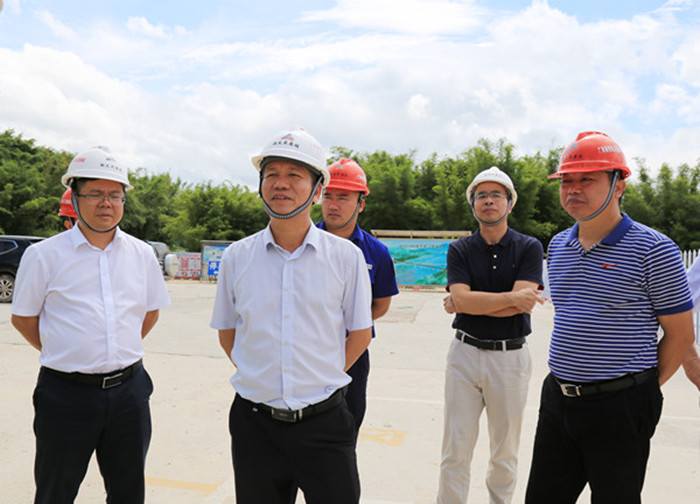 圖為朱堅(jiān)和董事長(zhǎng)(左二)在桂江大橋施工現(xiàn)場(chǎng)調(diào)研