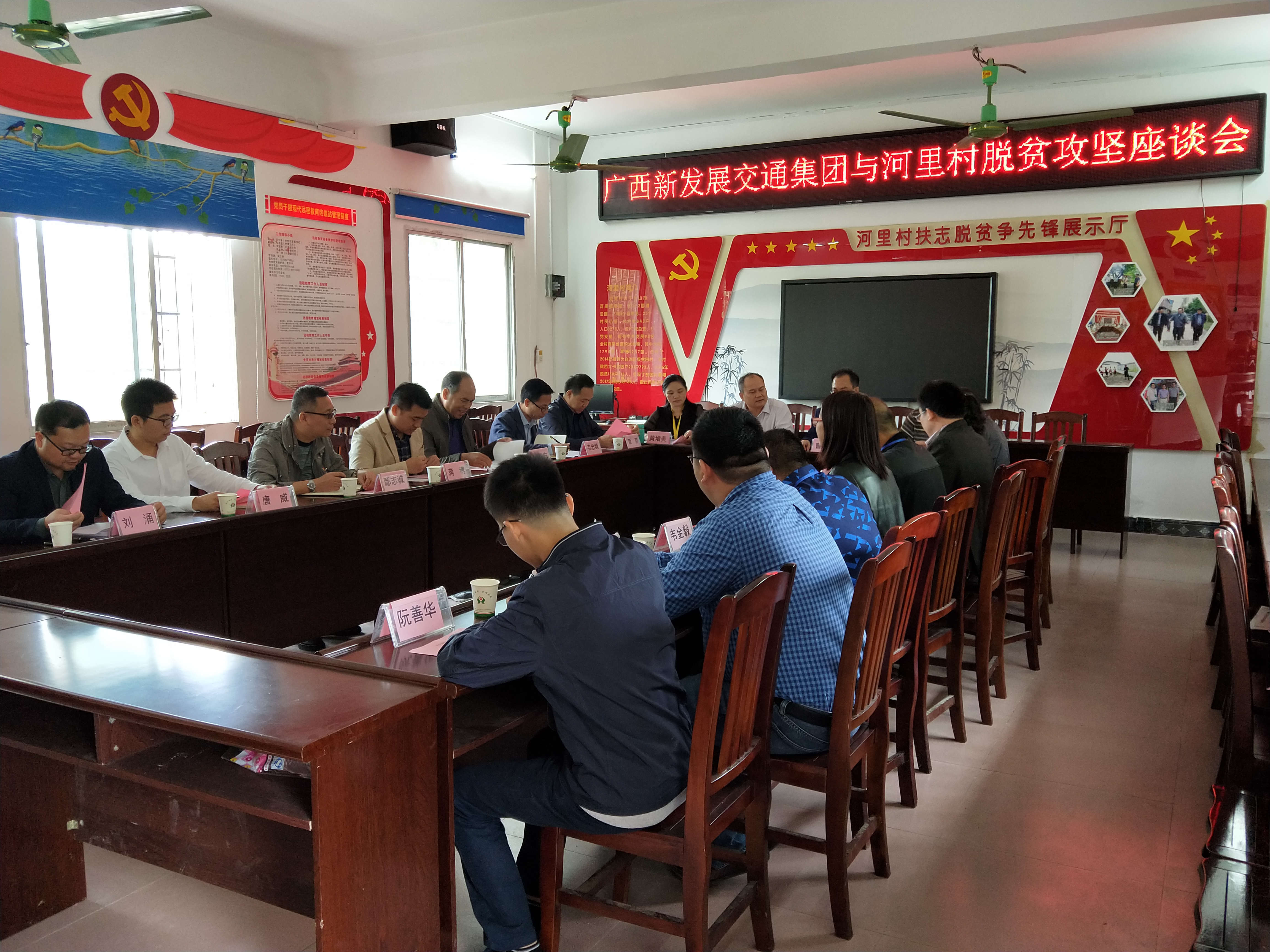與當(dāng)?shù)卣賳T、扶貧工作隊員、村民代表舉行座談會,商討河里村扶貧工作問題。
