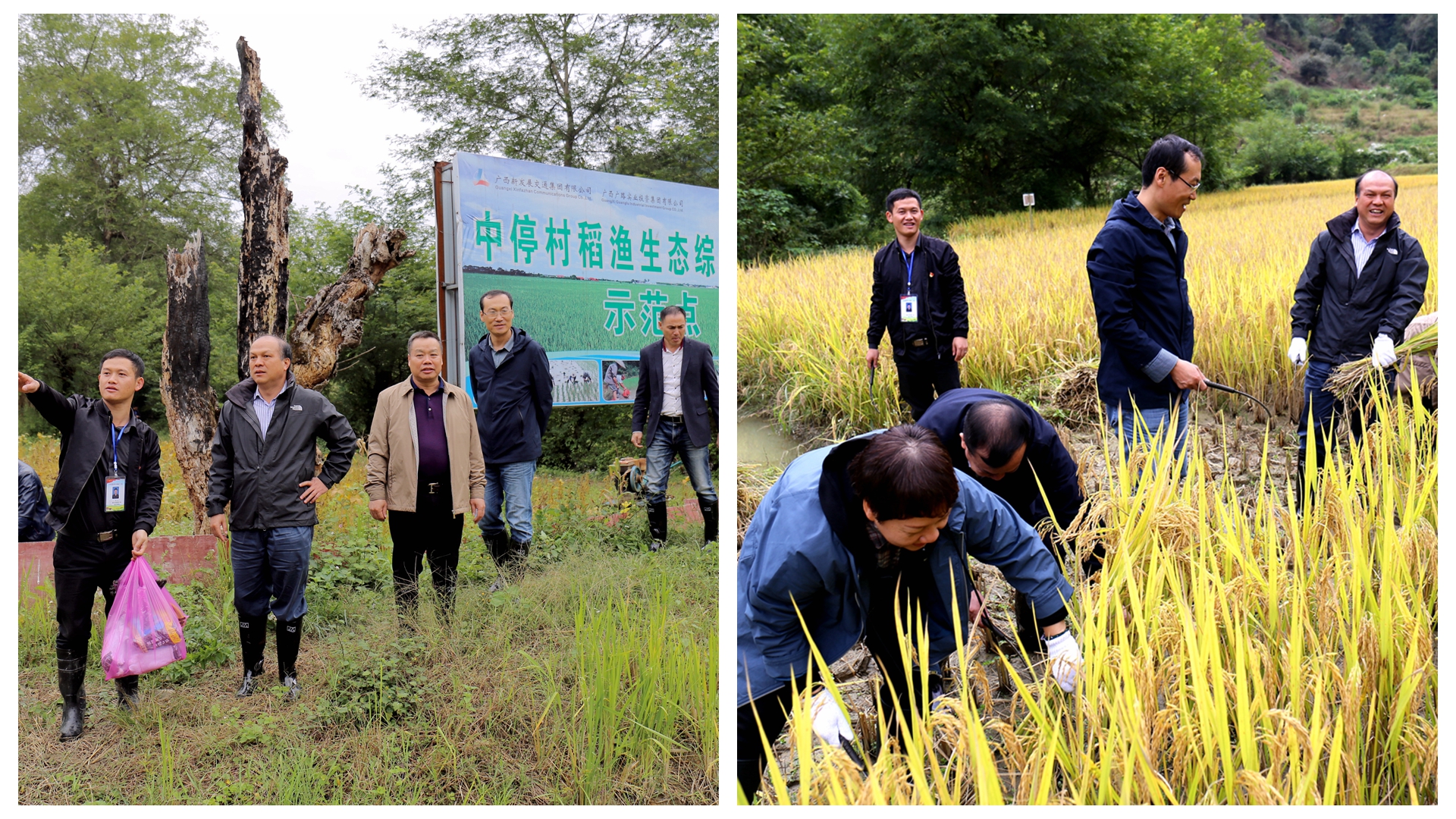 實地察看集團公司援助建設(shè)的中停村有機米產(chǎn)業(yè)(核心)示范區(qū),同村民一起收割稻谷。