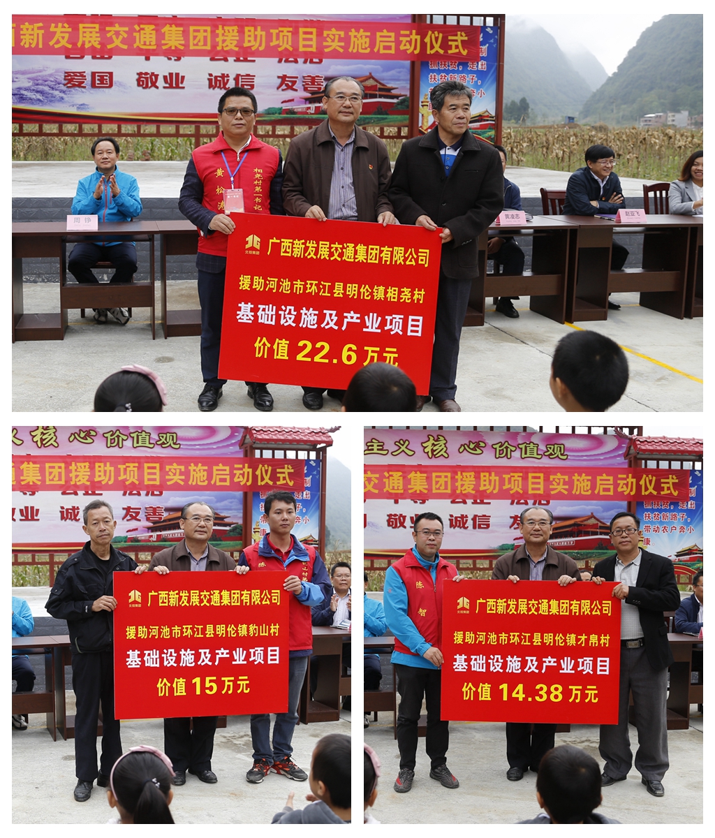 2018年10月17日是我國第5個扶貧日,按照自治區(qū)統(tǒng)一部署,新發(fā)展交通集團以“扶貧助困 共同前行”為主題,深入環(huán)江縣、樂業(yè)縣、合山市5個扶貧聯(lián)系村開展走訪慰問、基礎(chǔ)設(shè)施建設(shè)及產(chǎn)業(yè)項目援助、金秋助學(xué)、志愿聯(lián)建等活動。