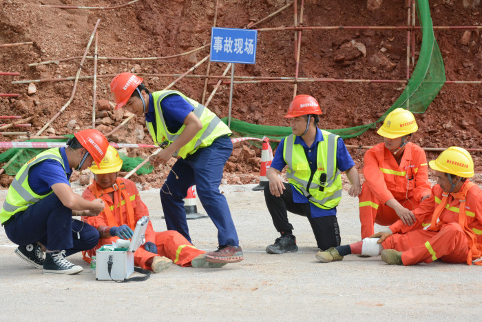 當天的演練現(xiàn)場模擬情景為:2019年6月20日,在羅城縣四把鎮(zhèn)沖灣屯附近,融河高速公路K54+100高邊坡處現(xiàn)場4名邊坡防護作業(yè)人員正在緊張的施工,由于連續(xù)雨天上邊坡坡頂土體部分突然滑落,繼而出現(xiàn)大的滑坡裂縫,隨之大面積土石體坍塌,1名施工人員被垮塌的土石壓埋。事故發(fā)生后,參與演練人員及時報告和啟動應急預案,在坍塌現(xiàn)場設置臨時指揮部,指揮現(xiàn)場救援,將傷者抬出被困位置后,在演練會場進行現(xiàn)場醫(yī)療和急救演示,再由救護車送到羅城縣人民醫(yī)院進一步治療。
